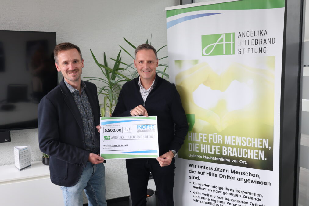 Die Besucherinnen und Besucher konnten an mehreren Essens- und Getränkeständen gegen einen kleinen Obolus Speisen und Getränke erwerben. Der gesamte Erlös aus diesen Verkäufen wurde von der Unternehmensleitung an die Angelika Hillebrand Stiftung gespendet. Im Rahmen einer feierlichen Scheckübergabe überreichte Michael Langerbein, Geschäftsführer der INOTEC Sicherheitstechnik, den symbolischen Scheck über 5.500 Euro an Burkhard Schrage, stellvertretender Vorsitzender der Angelika Hillebrand Stiftung. „Wir wollten unser Jubiläum nutzen, um nicht nur zu feiern, sondern auch etwas zurückzugeben“, erklärte Michael Langerbein bei der Übergabe. „Wir freuen uns sehr, dass wir mit unserer Spende die wertvolle Arbeit der Stiftung unterstützen können“